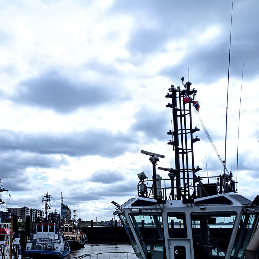 Deich, Wind, die Farben im Blaustich, der Himmel rau. Schiffe tuckern. Bunte Lichter in der Nacht.