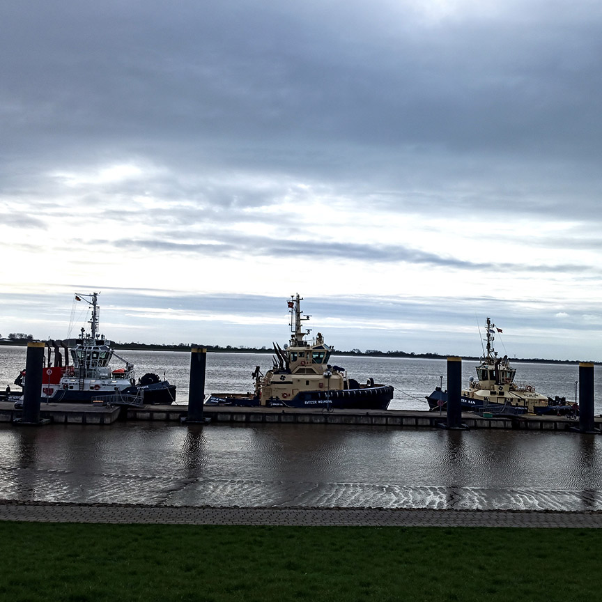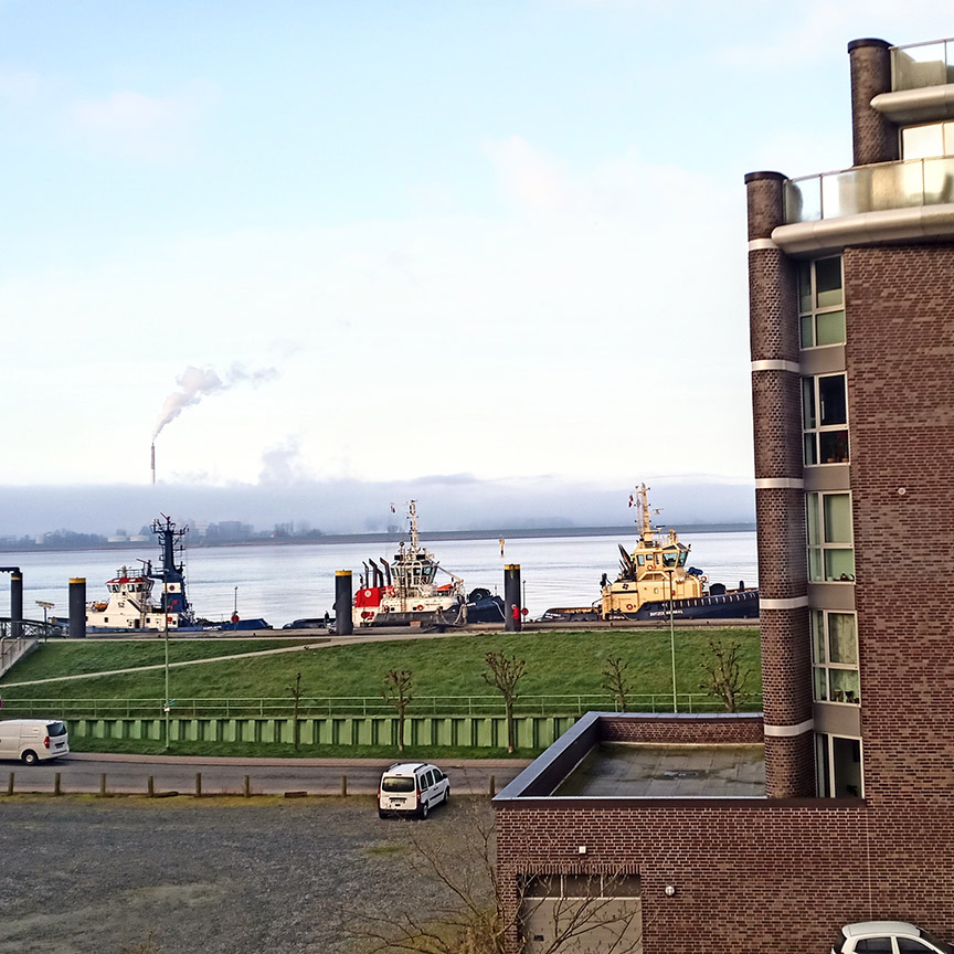 Deich, Wind, die Farben im Blaustich, der Himmel rau. Schiffe tuckern. Bunte Lichter in der Nacht.